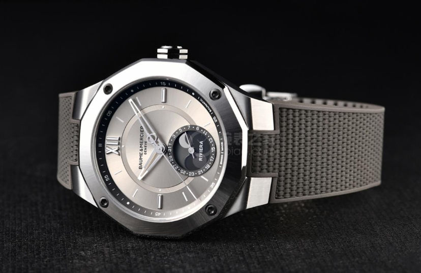 利維拉繫列的設計靈感來源於法國蔚藍海岸利維拉的隨性生活方式,全新利維拉Baumatic月相腕錶延續了這一風格,精鋼錶殼、配備四顆螺釘的十二邊形錶圈、以及可自行更換的一體式精鋼錶鏈或橡膠錶帶無一不展現名士品牌對適應當今時代的渴望。